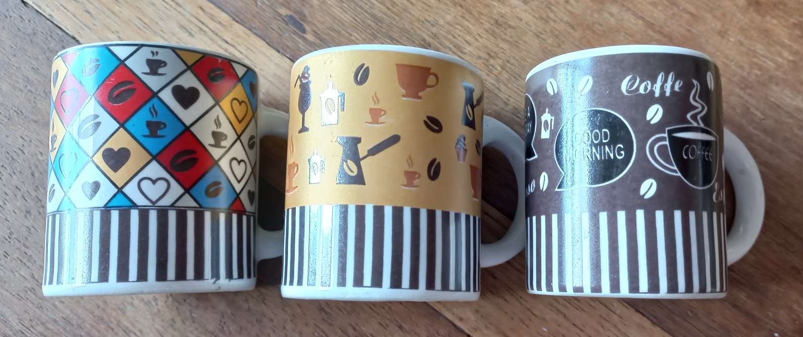 Kit com 3 canecas de cerâmica com estampadas variadas (no kit vem uma caneca de cada estampa conforme a foto).
